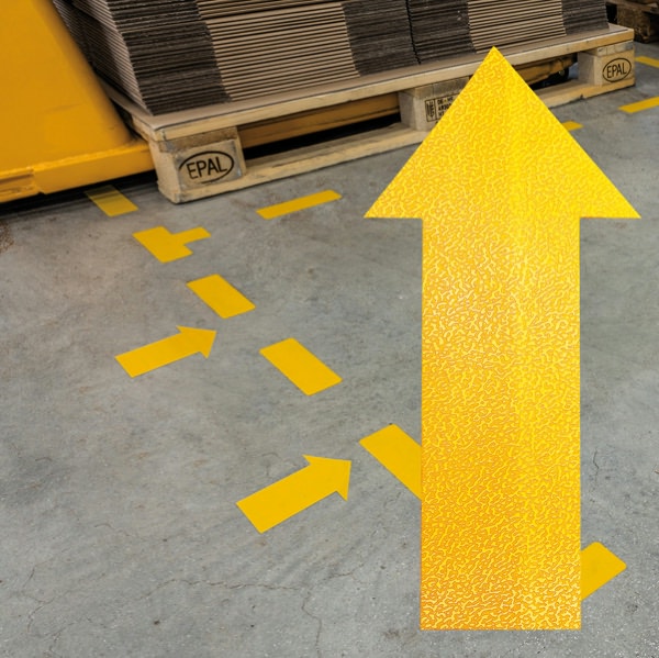 - Segnaletica da pavimento sagomata per l'individuazione di aree pericolose, spazi di stoccaggio, passaggi pedonali ecc. · Forma: "Freccia" · Simbolo adesivo per l'applicazione su pavimenti nelle aree interne · Robusto e resistente alle abrasioni · Resistenza allo scivolamento R9 conforme alla normativa DIN 51130 · Colore: RAL 1003 giallo segnale · Dimensioni: 100x200 mm, spessore 0,7 mm