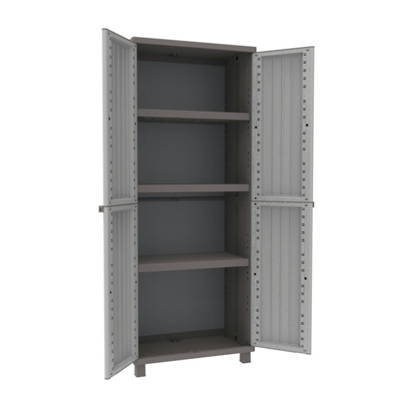 • Linea di armadi modulari con robusta struttura in PPL ed elegente finitura legno color tortora. Gli armadi hanno ante apribili a 180° e ripiani regolabili. Piedini rialzati e predispozizione per il lucchetto. Adatto sia per ambienti interni che esterni. Armadio a 2 ante con 3 ripiani regolabili. L68 x P37,5 x H170cm.