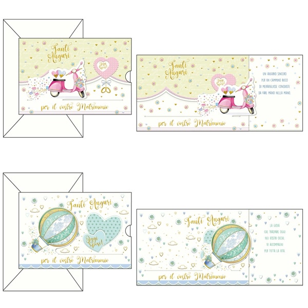 • Biglietti doppi formato 11,7x17cm. Stampa offset su cartoncino liscio bianco. Blisterati 1 busta/1 biglietto. Con rifiniture dorate stampa a rilievo.
