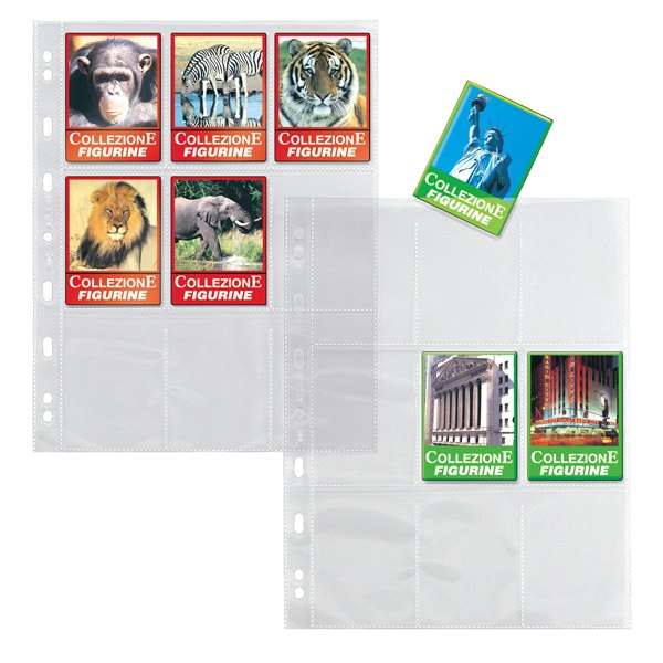 • Buste porta figurine con foratura universale in PP liscio. Dotate di 9 spazi per la raccolta di figurine. Formato esterno 210x297mm. Contiene 9 tasche da 60x90mm.