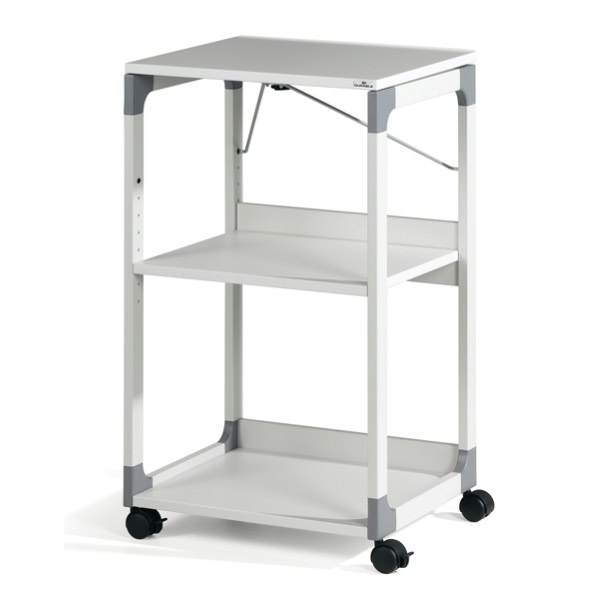 • STRUTTURA IN ACCIAIO VERNICIATO CON POLVERI EPOSSIPOLIESTERE ANTIGRAFFIO E RACCORDI ANGOLARI IN PLASTICA RESISTENTE. 3 RIPIANI CON MENSOLA SUPERIORE REGOLABILE IN ALTEZZA. SE USATO CON PROIETTORE "OVERHEADS", LA MENSOLA PUO' ESSERE SPOSTATA LETERALMENTE PER APPOGGIARE IL PROIETTORE SULLA MENSOLA CENTRALE. MENSOLA CENTRALE REGOLABILE (PASSO 32CM) E MENSOLA INFERIORE FISSA. Ogni ripiano ha portata max 30kg. DOTATO DI 4 RUOTE PIVOTTANTI DI CUI 2 BLOCCABILI. DIMENSIONI: L 508 X P 432MM - H 882MM.