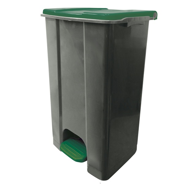 - Contenitore in polipropilene plastica riciclata (minimo 70%); sistema d’apertura del coperchio in plastica; ampio pedale nel colore del coperchio per utilizzo conforme al metodo HACCP; maniglia di trasporto posteriore integrata; ruote in plastica per un facile spostamento. Contenitori risultano particolarmente adeguati sia per uso interno che esterno. Dimensioni: 480 × 390 × 750 mm. Capacità: 80lt. La tonalità di grigio del contenitore, essendo realizzato in plastica riciclata, è soggetta a possibili variazioni (grigio scuro o grigio chiaro).