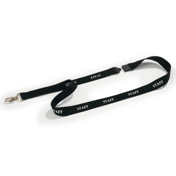 • Cordoncino in tessuto con stampa bianca STAFF con sgancio di sicurezza antisoffocamento e moschettone portabadge. Lunghezza 44cm, larghezza 2cm.