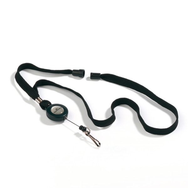 • Cordoncino in tessuto nero da 10 mm con chiusura di sicurezza antisoffocamento e meccanismo a chiocciola tipo yo-yo da 80 cm integrata. La chiocciola include un moschettone di ancoraggio, in metallo, adatto ad ogni tipo di portabadge.