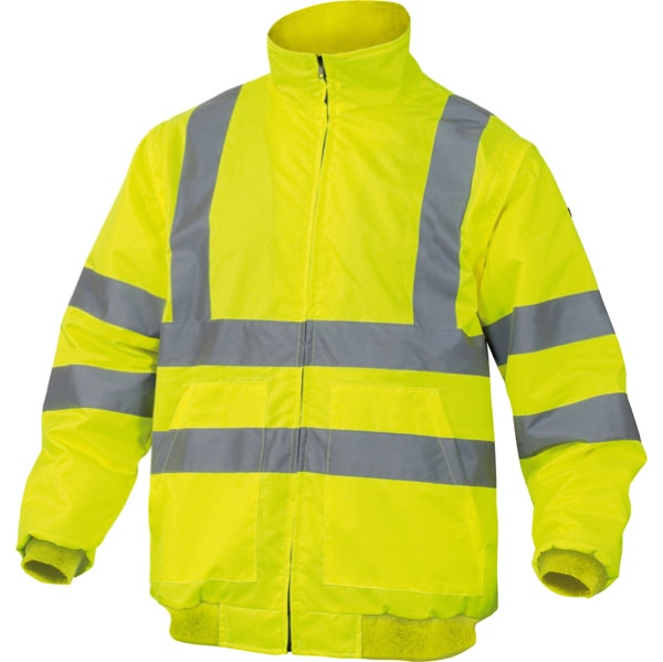 • Giubbotto alta visibilità Oxford spalmato PU. Fodera pile poliestere. Maniche staccabili. Cuciture impermeabili. Cappuccio fisso. Collo foderato pile. Polsini e parte bassa bordo a coste. Categoria DPI: 2. Certificazione CE. Conformità alle norme EN ISO 13688:2013, EN343:2003 A1:2007 e EN ISO 20471:2013.