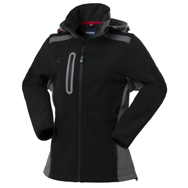 • Giubbotto da donna realizzato in tessuto softshell a tre strati, chiusura anteriore con zip waterproof, cappuccio staccabile con zip e coulisse, pratico foro in silicone per cuffie. Un taschino a filetto al petto destro chiuso con zip waterproof verticale e profilo rifrangente, due tasche inferiori a filetto chiuse con zip waterproof, carré e foro di aerazione su schiena, polsi profilati con bordo elastico, INSRTi di colore a contrasto.