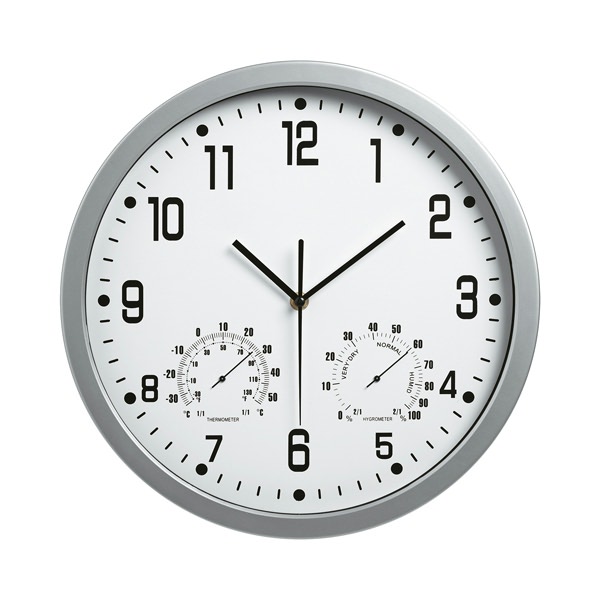 • Orologio da parete in ABS con igrometro e indicatore di temperatura, funzionamento a batteria (non inclusa). Diametro 35 x 4 cm. Orologio non dotato di meccanismo silenzioso.