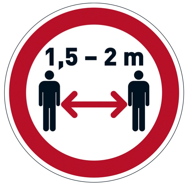 • Pittogramma adesivo da pavimento con simbolo di divieto "Mantenere la distanza di sicurezza". Dotato di adesivo rimovibile adatto a pavimenti in aree interne, ad es. in supermercati, palestre, hotel, ristoranti, stazioni di servizio. Assicurarsi che la superficie del pavimento sia liscia, robusta, pulita e priva di grasso e polvere. Pittogramma conforme alle normative ASR A1.3 e DIN EN ISO 7010. Resistenza allo scivolamento R9. Dimensioni: Ø 430 mm, spessore: ca. 0,2 mm