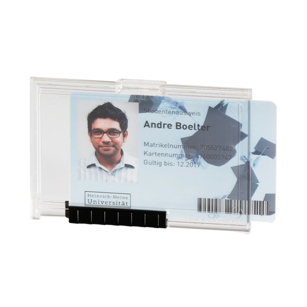 • Elegante portabadge con comparti separati per contenere e proteggere 1 tessera formato 54x87mm. Utilizzabile sia in posizione orizzontale sia verticale. Perfetto per proteggere tessere con chip RFID e con banda magnetica. Levette scorrevoli per una facile espulsione delle tessere. In plastica trasparente crystal-clear di alta qualità.