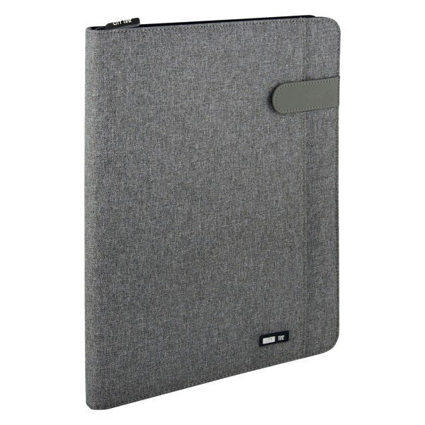 • Portablocco in tessuto tecnico e chiusura in ecopelle. Formato A4 chiusura con zip, tasca esterna con chiusura a bottone, scomparti per biglietti, tasca interna portadocumenti, portapenna, completo di blocco. Dimensioni: 25x33,5cm.