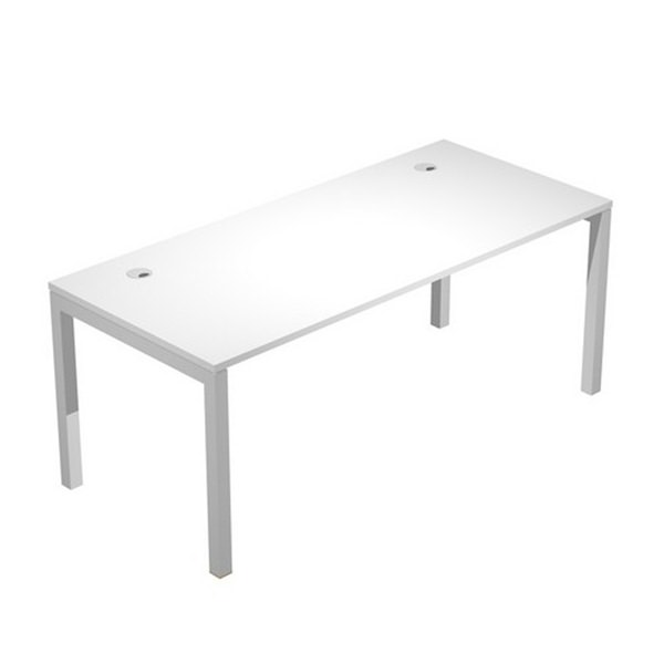 - Scrivania per postazione singola dimensioni: L160 x P80 x H74,6cm. Le scrivanie per postazione singola o multipla, sono in bilaminato nobilitato melaminico conforme alle norme UNI e EN classe E1, antigraffio ed antiriflesso, hanno sp. 25 mm con bordo sp. 2 mm in ABS resistente agli urti. Sono caratterizzate da robuste gambe a ponte in metallo a sezione quadrata (50 x 50 mm) verniciate a polveri epossidiche nel colore grigio alluminio, complete di piedini regolabili in altezza.
