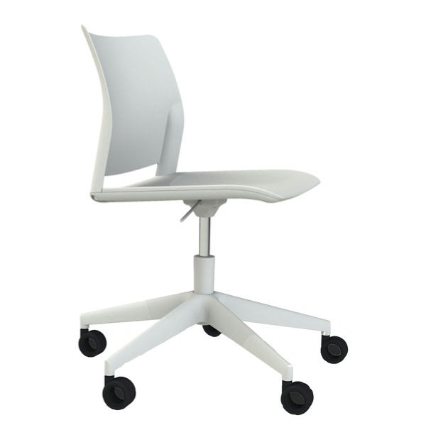 • Seduta girevole in polipropilene con schienale fisso. Base in nylon di colore bianco, elevazione a gas. Senza braccioli. Alt.tot.: 81-92; Prof.tot.: 62; Larg.seduta: 50cm; Altezza seduta: 44-55cm