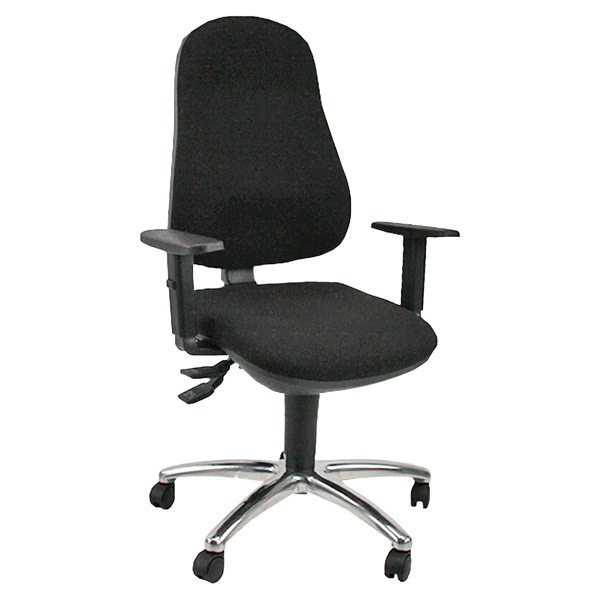 • Seduta operativa con schienale alto con sagomature lombari. Meccanismo sincronizzato a 2 leve per la regolazione in altezza del sedile e schienale. Rivestimento in tessuto ECO Eco. Elevazione a gas e base cromata con ruote. Braccioli regolabili.