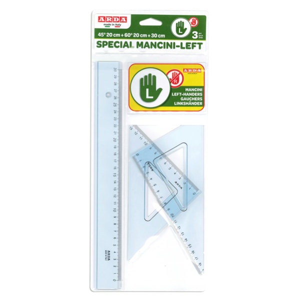 • Set contenente 1 riga da 30cm e 2 squadre da 45° e 60° Milimetratura speciale invertita da destra verso sinistra.