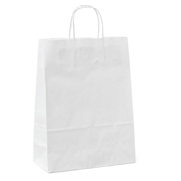 • Shopper in kraft bianco, prodotte con carta riciclabile, ad elevata resistenza. Colore bianco. Dimensione 14x9x20cm.