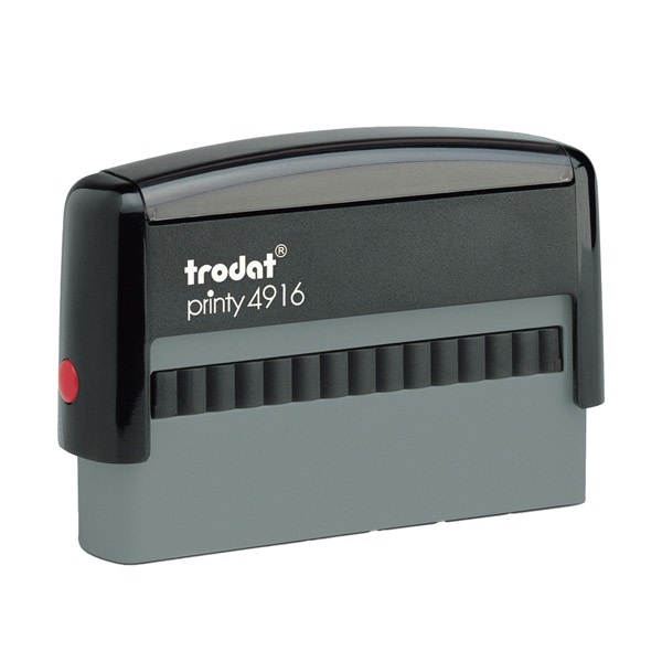 - Timbro di testo autoinchiostrante con max. 3 righe di testo 4916 PRINTY, NERO ECO, TAMP. NERO. Facile montaggio della piastra di testo Inserimento della cartuccia di inchiostro da entrambi i lati del timbro Sostituzione semplice della cartuccia di inchiostro Contiene inchiostro indelebile a base d’acqua Trodat