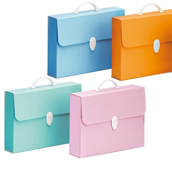 • Valigetta in polipropilene alveolare colori pastello assortiti (azzurro, verde, arancio e rosa). Maniglia e chiusure in bianco.